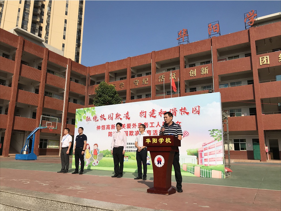 為推進“不忘初心、牢記使命”主題教育工作走向深入,加強未成年人思想道德建設(shè),關(guān)心關(guān)愛異地務(wù)工人員子女,11月12日上午,仲愷高新區(qū)“關(guān)愛異地務(wù)工人員子女防治校園欺凌”活動于在華陽學(xué)校正式啟動。區(qū)委政法委、區(qū)宣教文衛(wèi)辦相關(guān)負責(zé)人以及華陽學(xué)校學(xué)校師生共1000多人參加了啟動儀式。