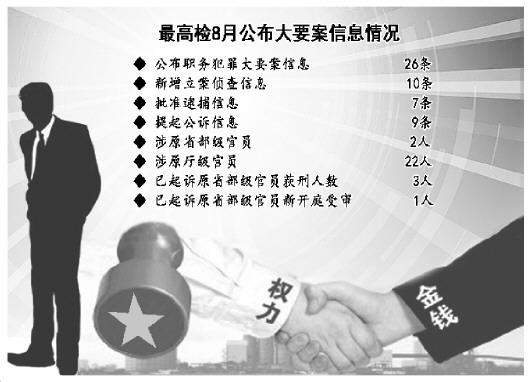 《法制日報》記者今天梳理發現,最高檢官方網站8月共公布職務犯罪大要案信息26條,涉原省部級官員兩人、廳級官員22人。在檢察機關已經起訴的原省部級官員案件中,3人獲刑,1人新開庭受審。
