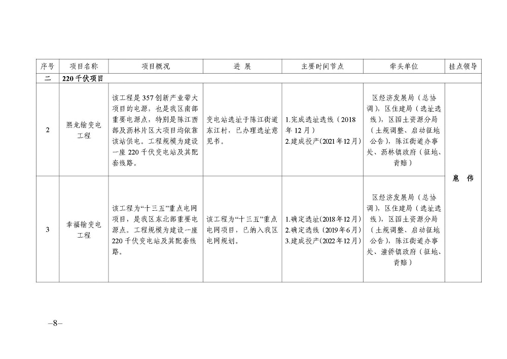 1. 220千伏熙龍輸變電工程。該工程是357創(chuàng)新產(chǎn)業(yè)帶大項目的電源,也是我區(qū)南部重要電源點,特別是陳江西部及瀝林片區(qū)大項目均依靠該站供電。工程規(guī)模為建設(shè)一座220千伏變電站及其配套線路。工程在2018年12月底前完成選址選線工作,規(guī)劃2021年12月前建成投產(chǎn)。